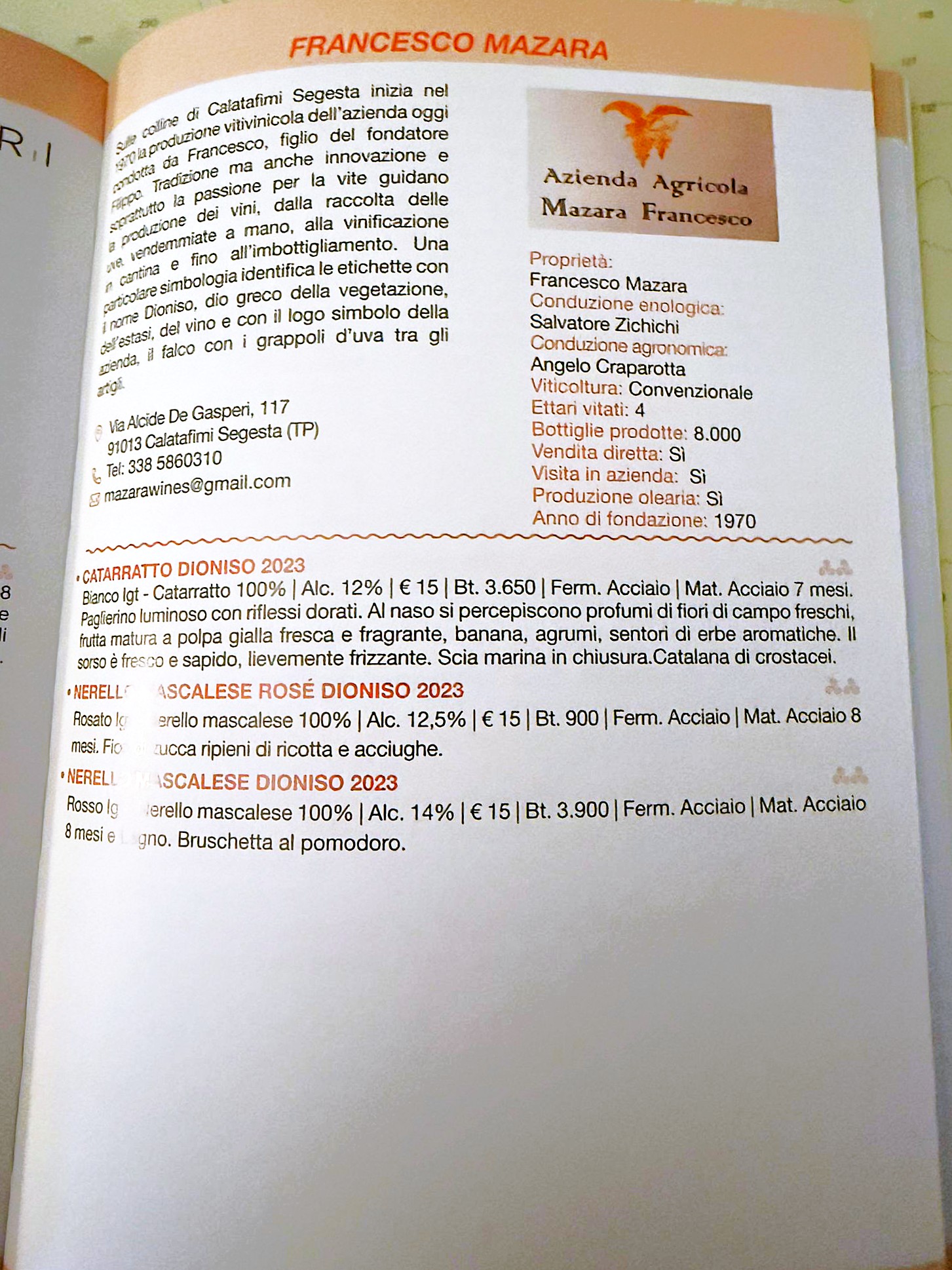 Il logo dell’azienda (falchetto con i grappoli d’uva tra gli artigli) unico in quanto non ne esiste un altro simile, proviene da un’antica etichetta della Famiglia Mazara del 1989, ha un forte legame con il territorio, in quanto il falco è presente sul gonfalone del Comune di Calatafimi Segesta, ed è un rapace tutt’oggi presente nel territorio. Questo riporta le iniziali del mio nome MF (Mazara Francesco), ma sono anche le iniziali di mio padre Mazara Filippo fondatore dell’Azienda.